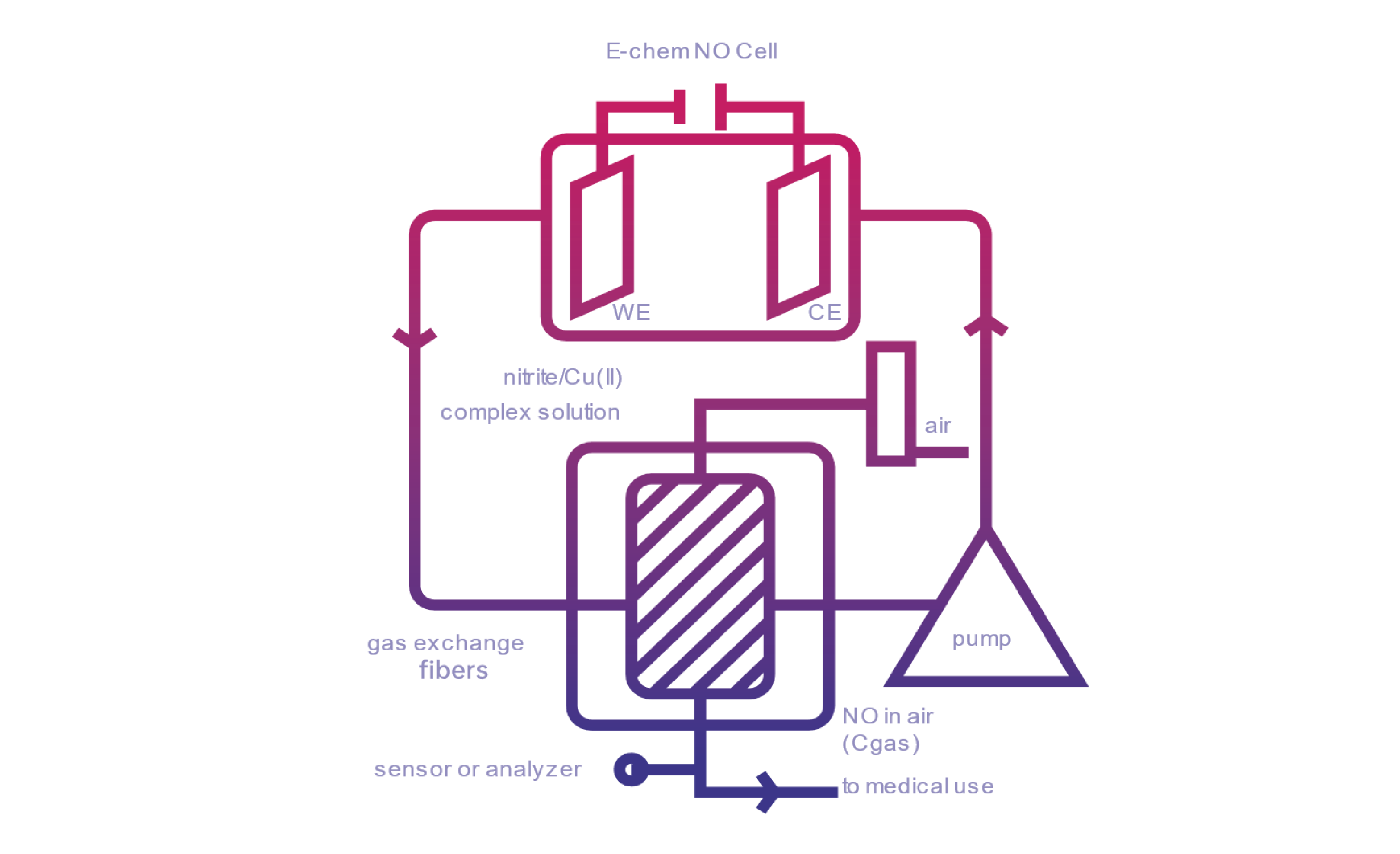 以擁有多種價(jià)態(tài)的過(guò)渡金屬離子作為催化核心的NO發(fā)生技術(shù)。通過(guò)精確控制的電流使高價(jià)態(tài)的金屬離子變?yōu)榈蛢r(jià)態(tài),將亞硝酸根離子還原為NO。同時(shí)金屬離子回到高價(jià)態(tài),重新參與進(jìn)新一輪的反應(yīng)過(guò)程。